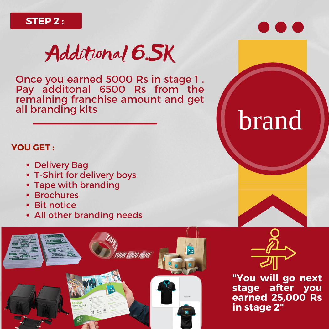 Once you earn ₹5,000 from your franchise, pay ₹6,500 to get your Branding Kit (Delivery Bag, T-shirt, Brochures, Bit Notices & More).